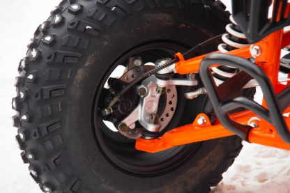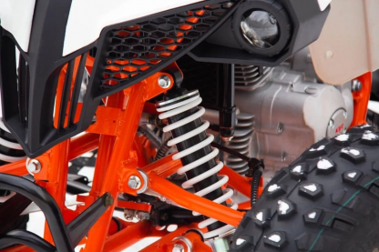 Подвеска квадроцикла KAYO A200 собрана с учетом особенностей использования модели: передние гидравлические амортизаторы с увеличенным ходом задействованы в независимой рычажной подвеске; задняя подвеска маятникового типа оснащена мощным моноамортизатором со ступенчатой регулировкой преднатяга пружины и параметров сжатия/отбоя.
