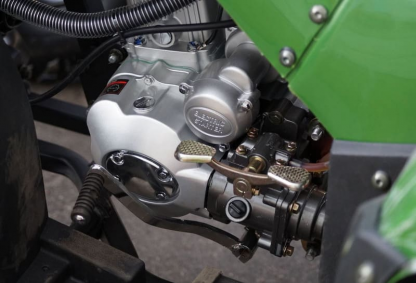 ЭРГОНОМИКА. Утилитарник Сталкер обеспечивает удобство управления благодаря кнопке запуска на руле, которая активирует электростартер. Также на руле расположен рычаг для пускового обогащения карбюратора, что упрощает запуск двигателя в различных условиях. Высокие покрышки на десятидюймовых колесах способствуют комфортному передвижению по пересеченной местности, а также по снежным участкам и бродам.