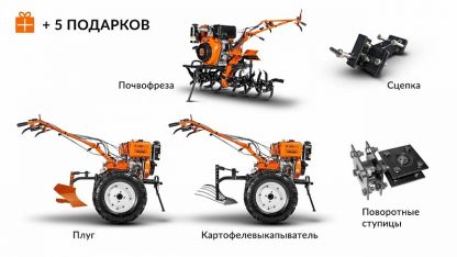 Плуг, Сцепка, Картофелевыкапыватель, Фрезы, 2 Поворотные ступицы, ВОМ, Японский двигатель, Электростартер, Шестерёнчатый редуктор, Колеса с индустриальным протектором, Глубиномер (сошник), Регулировка положения руля, Набор запасных частей, Кнопка экстренной остановки, Пониженная передачаИнформацию о стоимости и сроках уточняйте у менеджеров магазина.