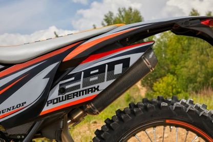 Подвеску Sharmax Power Max 280 можно настроить под грязь, камни и песок без потери качества. Передняя вилка фирмы KKE имеет регулировки сжатия и отбоя, задняя (KKE) — справится с любыми преградами, от камней до деревьев. Байк легко настроить под свой вес, подобрав идеальный баланс жёсткости.